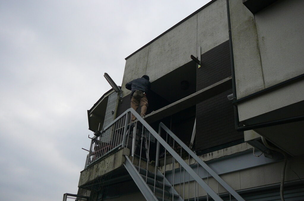 2階にある住居へ上がる鉄骨の外階段です。冬場は毎日霜で凍り、上がり下りが大変危ない階段でした。今回は階段上部にアルミのテラス屋根を取り付けて、階段全体をすっぽりと覆い隠しました。足場が悪いため施工は困難をきわめました。