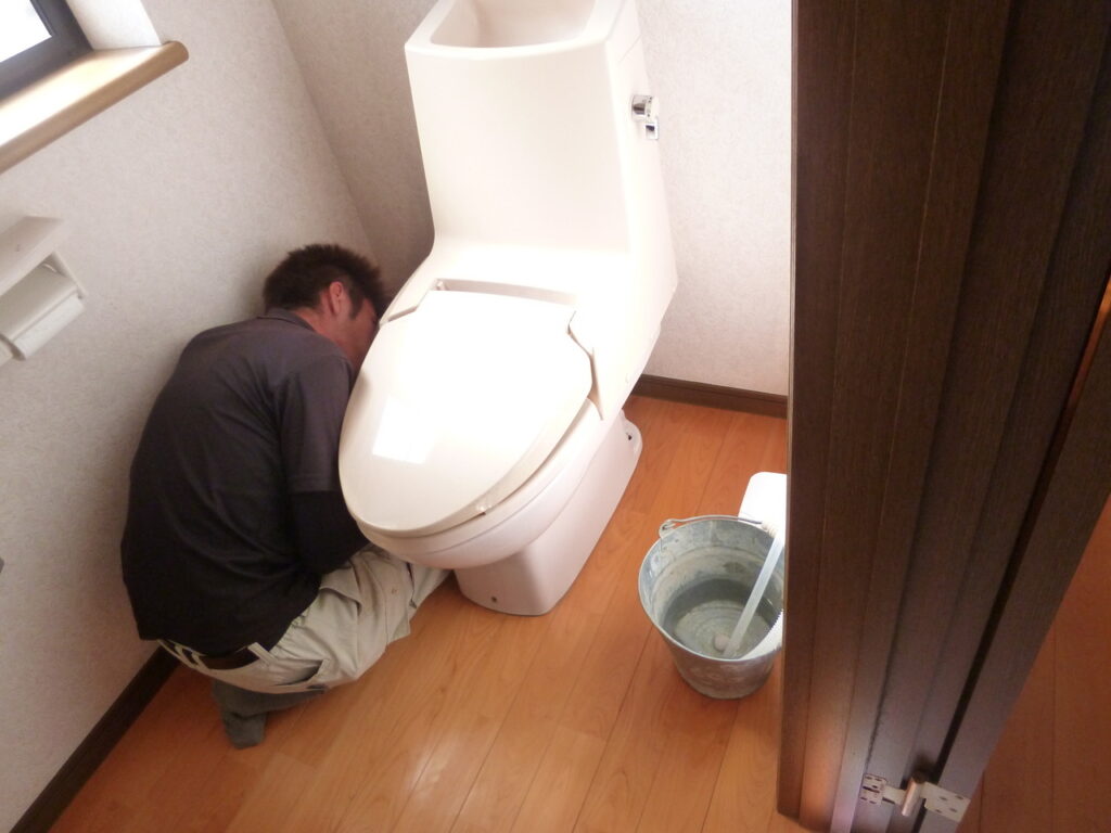 • 既存の便器取り外し奮闘中の水道屋さん。