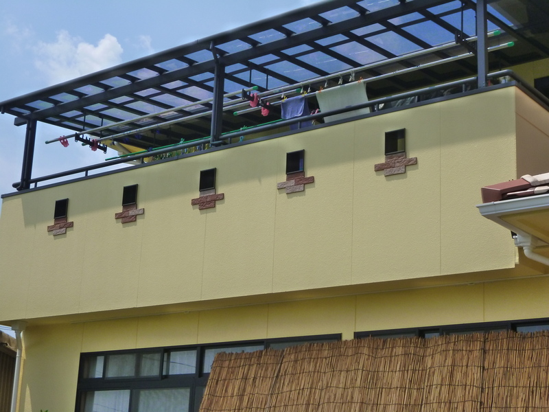 バルコニー全体を覆うアルミのテラス屋根も完成。洗濯物もたくさん干せて、夏はお孫さんのプール遊びができます。小窓下のタイルがアクセントです。