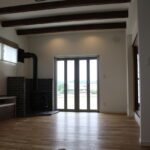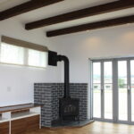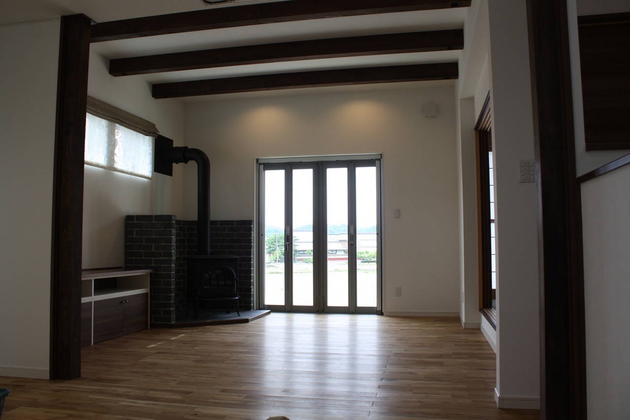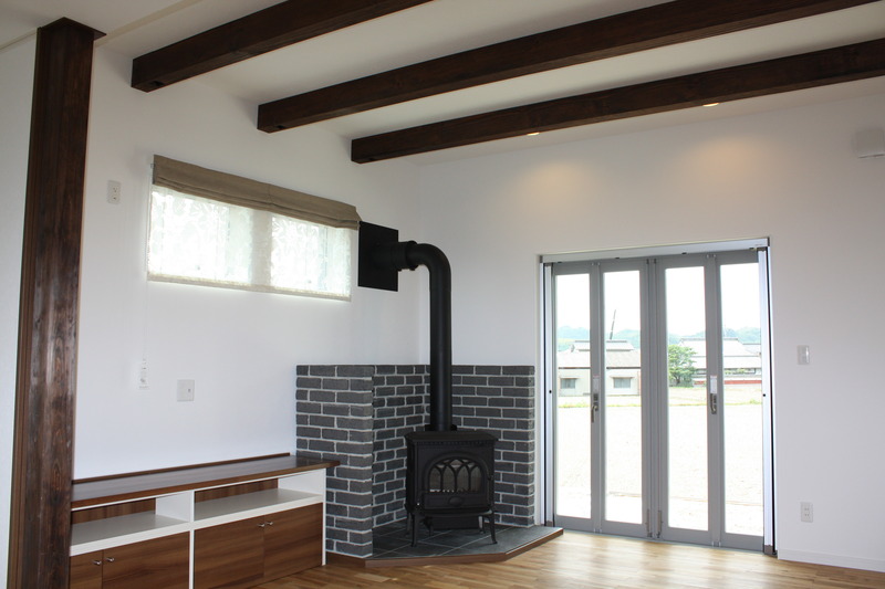 • そしてリビングには薪ストーブを備えつけました。オープンサッシからおしげなく光が入り、冬場は家族みんなで暖をとれます。 天井の化粧梁はご主人と私で塗りました。