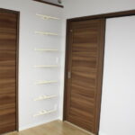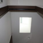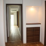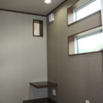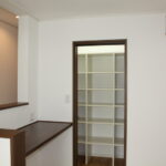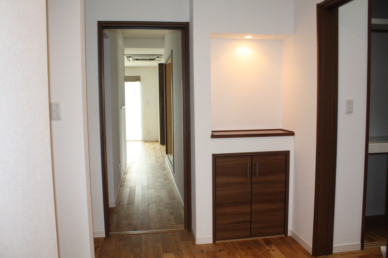 • 玄関内部正面にはちょっとした飾り棚と収納を造りました。 正面廊下を抜けると大空間のリビングです。