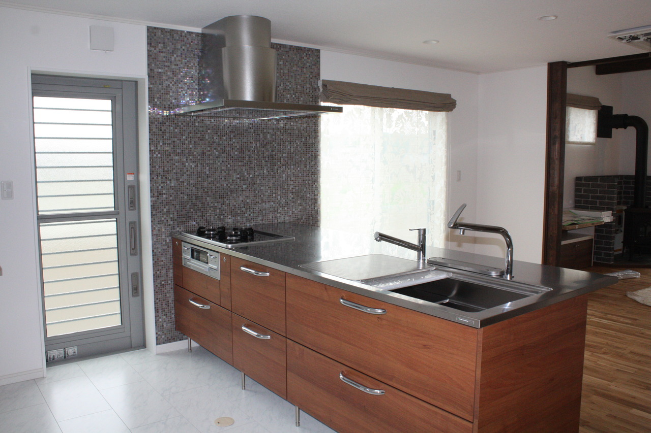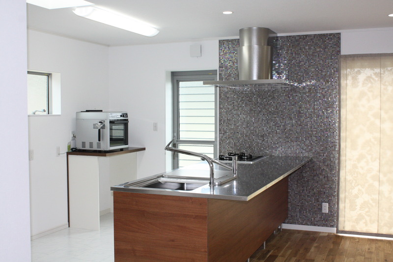 • まずはキッチン。この度はトーヨーキッチンさんを採用させていただきました。まさに見せるキッチンですね。奥様こだわりのモザイクタイルもキラキラと輝いてます。