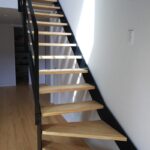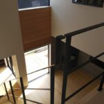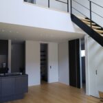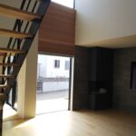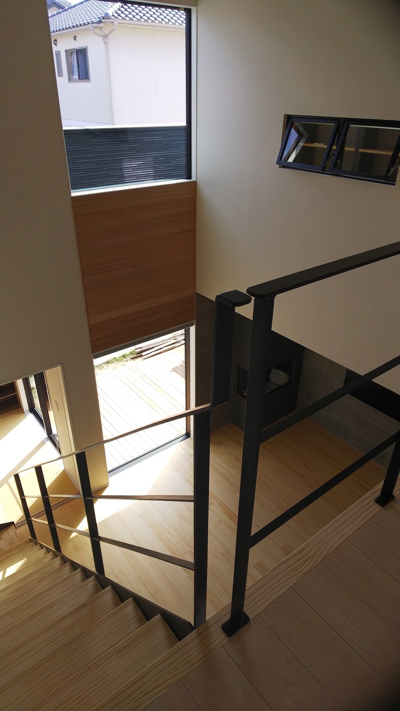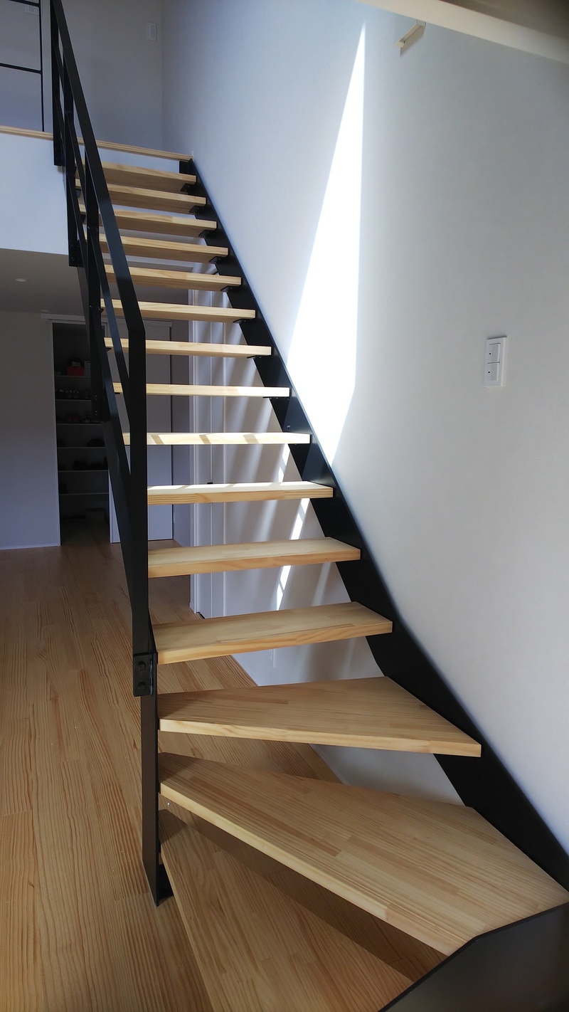 シンプルな室内でひと際目をひく、存在感のあるアイアンのリビング階段。