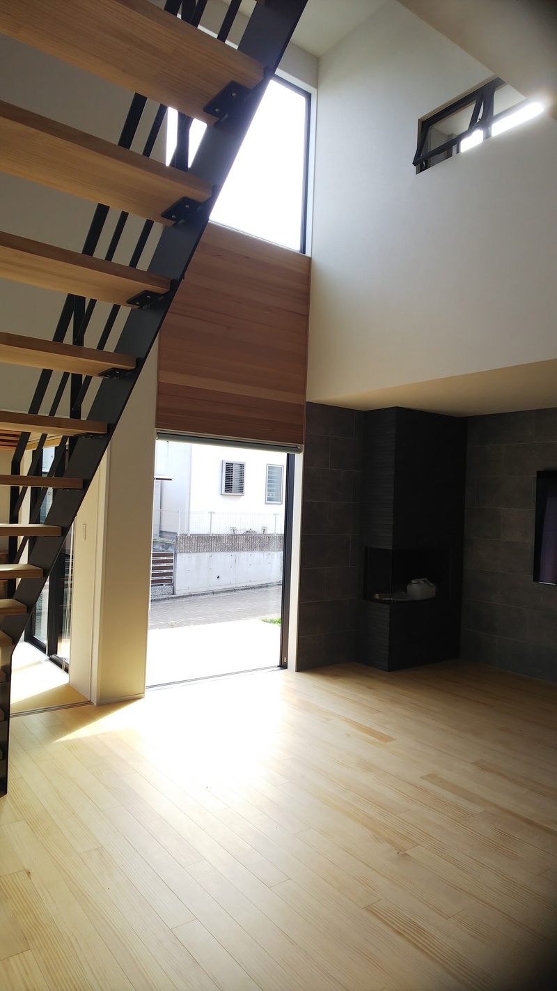 また、吹き抜けの大きな窓から入る太陽光がリビングを明るく照らします。