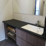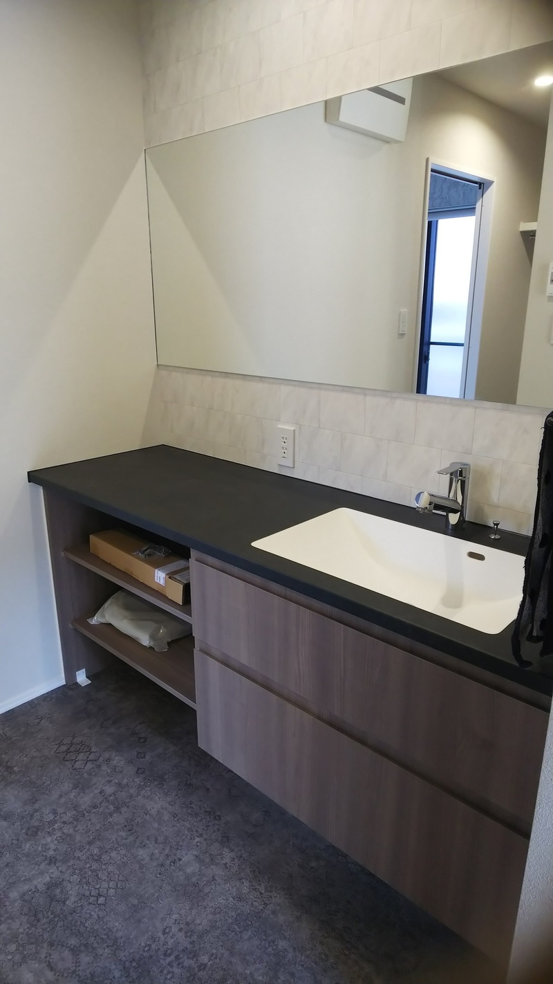 間口の広いカウンターと鏡で、朝の支度の混雑を解消します。