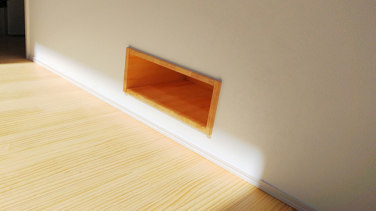 リビング壁掛けTV下にデッキスペース(玄関側の収納内に奥行を確保)