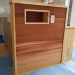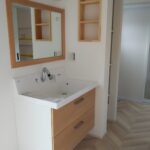 機能性も重視した木のぬくもりを感じる洗面台 床はヘリンボーン柄のクッションフロア