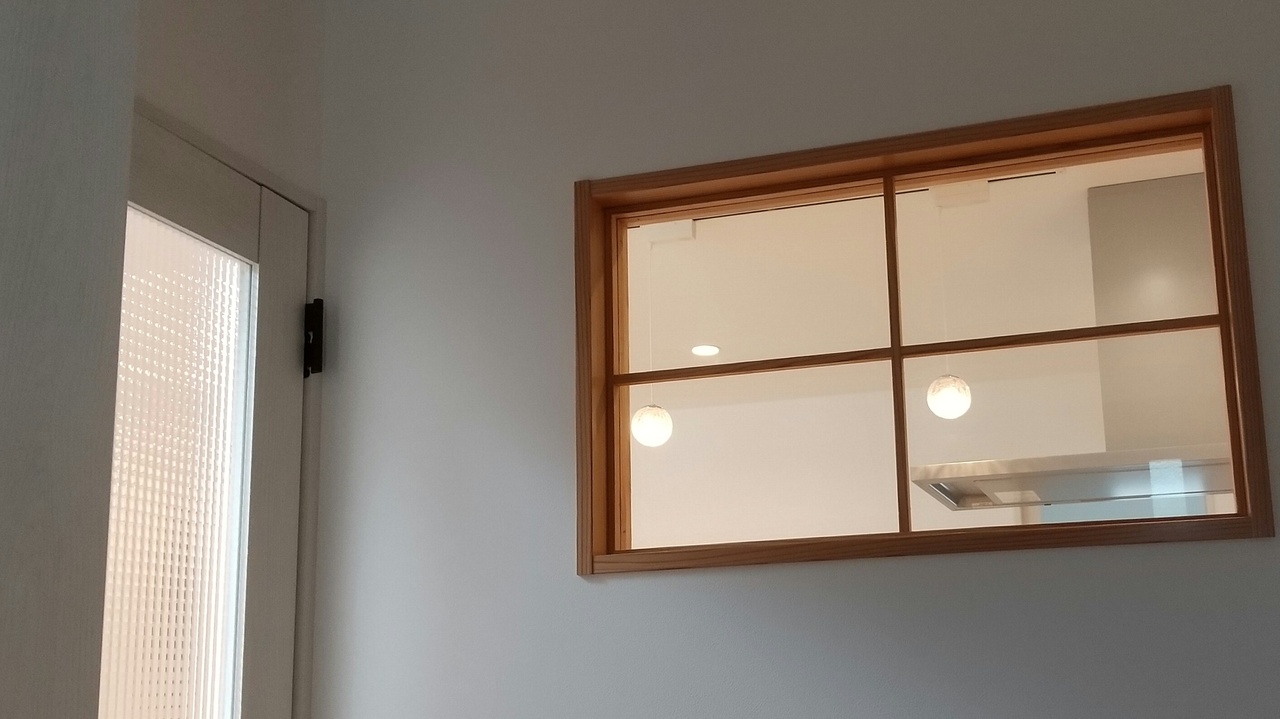 キッチンから玄関の入口の様子が分かる かわいい造り付けの窓